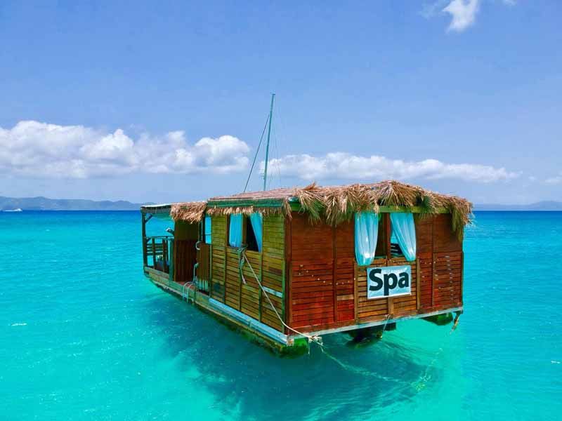 Access to the spa is by water. Mapp provides a complimentary dinghy taxi to and from, but more adventurous guests choose to boat, paddle board, kayak, or swim their way there. There are four treatment rooms, where guests can enjoy spa treatments and, as Mapp told Spa Executive, “the feeling of floating on the Ocean with the gentle sway, reminiscent of being rocked in a cradle while inhaling the most revitalizing sea air.” Rectangular windows under the massage tables, inspired by glass bottomed boats, allow people to gaze into the water and watch the colorful fish swimming around below.